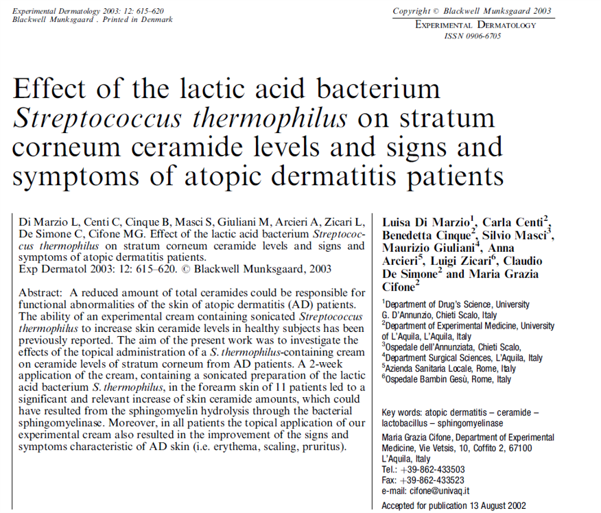 - Di Marzio L, Centi C, Cinque B, Masci S, Giuliani M, Arcieri A, Zicari L, De Simone C, Cifone MG Effect of the lactic acid bacterium Streptococcus thermophilus on stratum corneum ceramide levels and signs and symptoms of atopic dermatitis patients Exp Dermatol 2003; 12:615-620