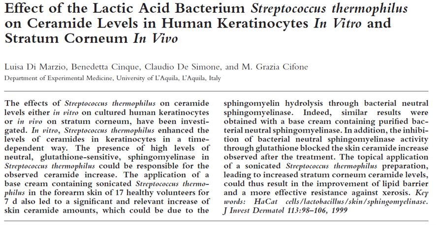 - Di Marzio L, Cinque B, De Simone C, Cifone MG. Effect of the lactic acid bacterium Streptococcus thermophilus on ceramide levels in human keratinocytes in vitro and stratum corneum in vivo. J Invest Dermatol. 1999 Jul; 113(1):98-106.
